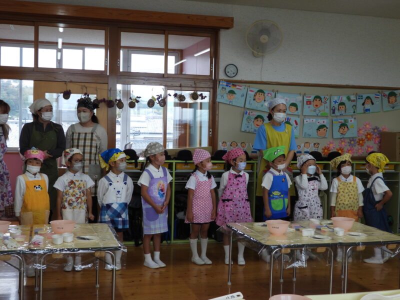 朝のご挨拶をして、おにぎり作りのお話を聞きました。