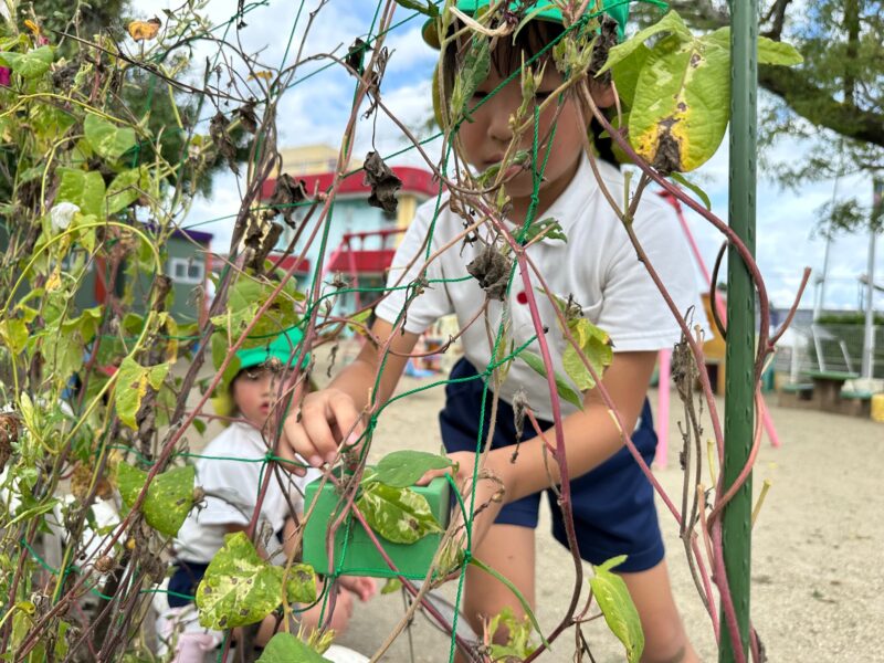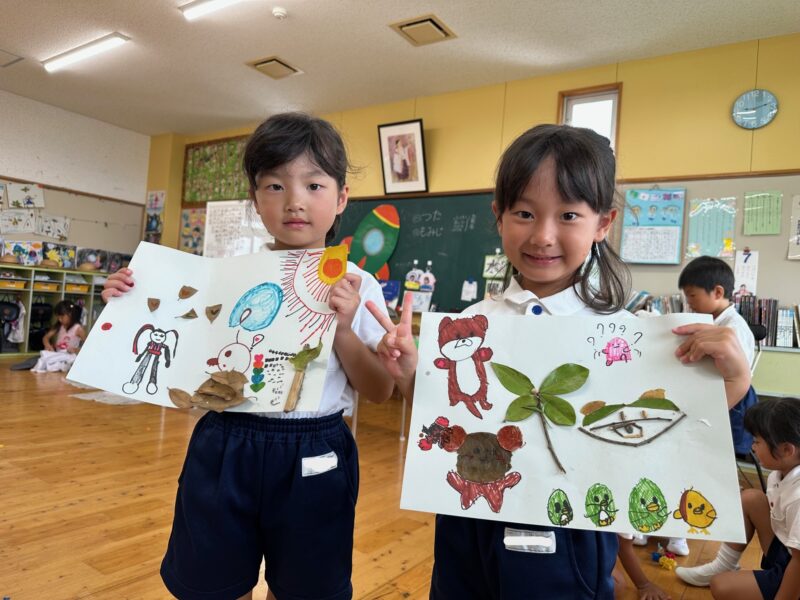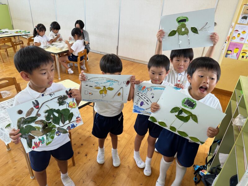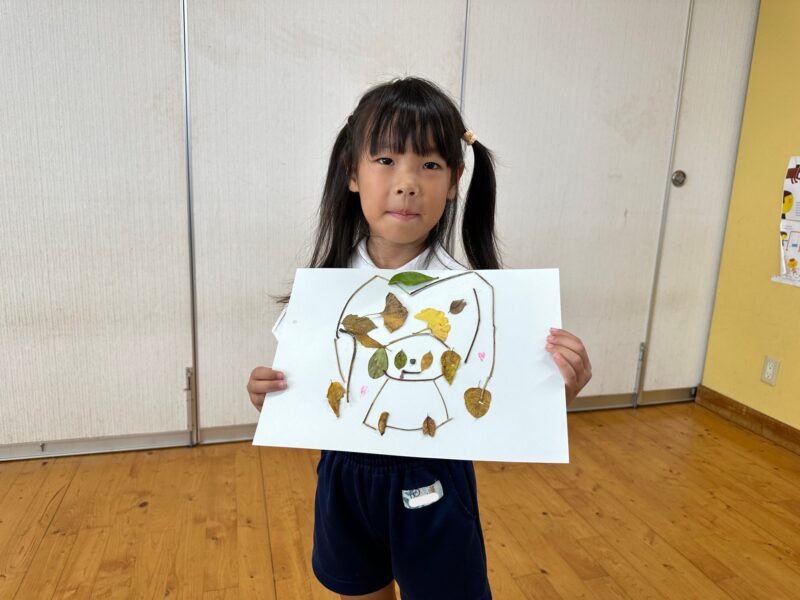 10月の製作は、園庭にある落ち葉や枝などを拾って