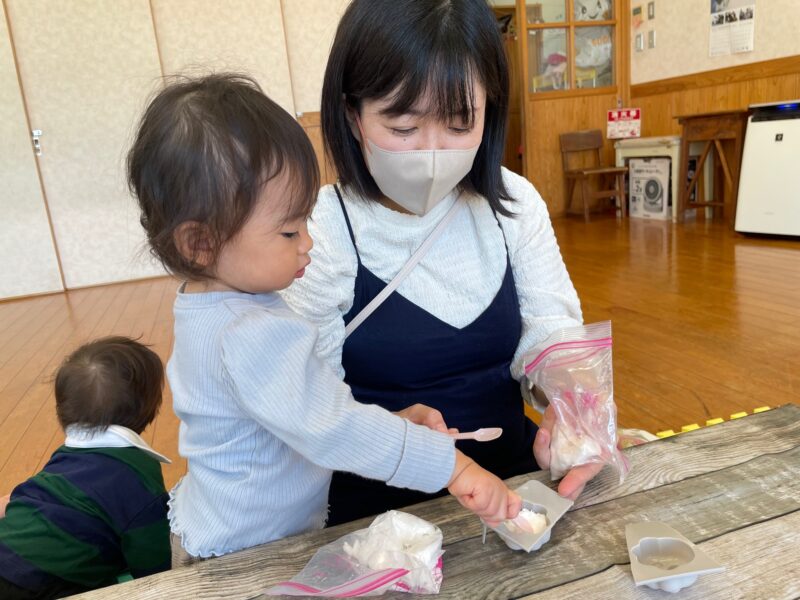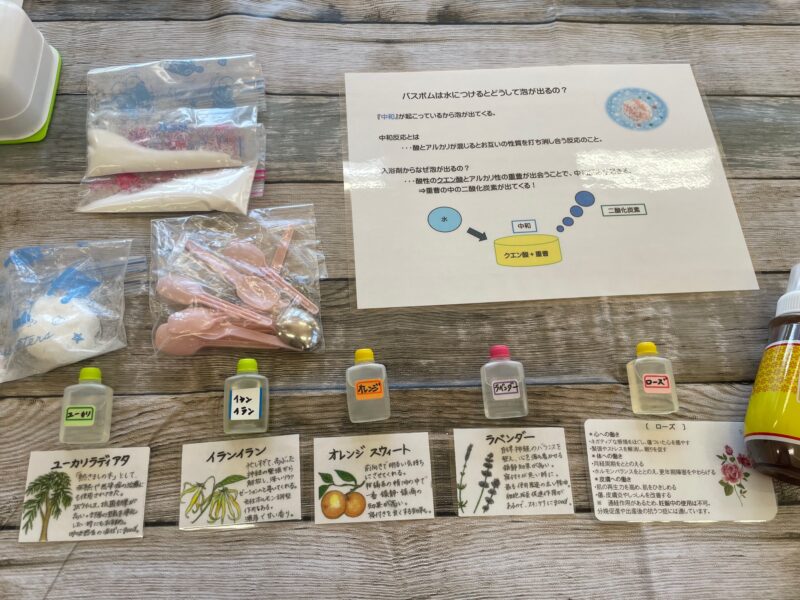 バスボムの元となる重曹やクエン酸を親子で一緒にシャカシャカしたりもみもみしたりと