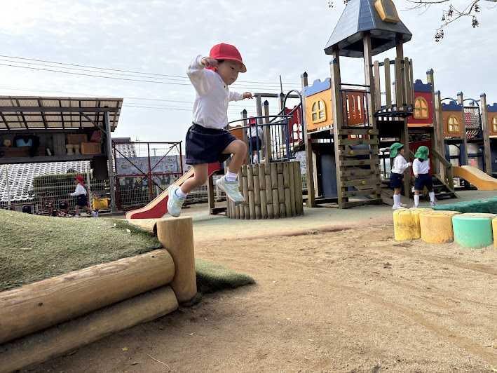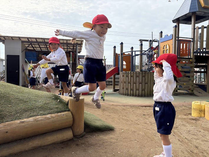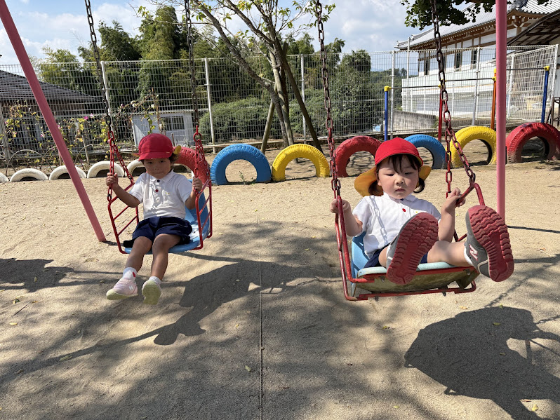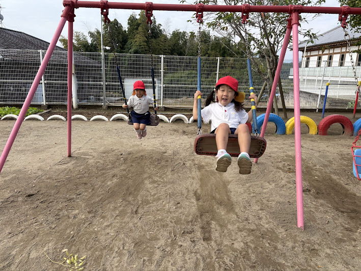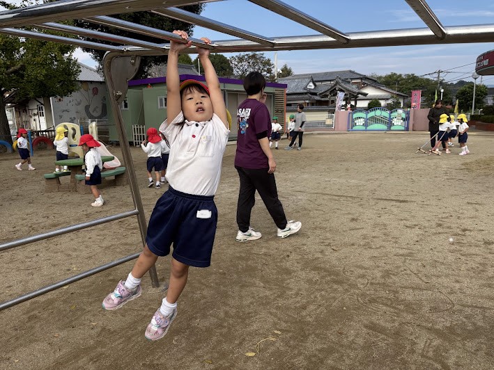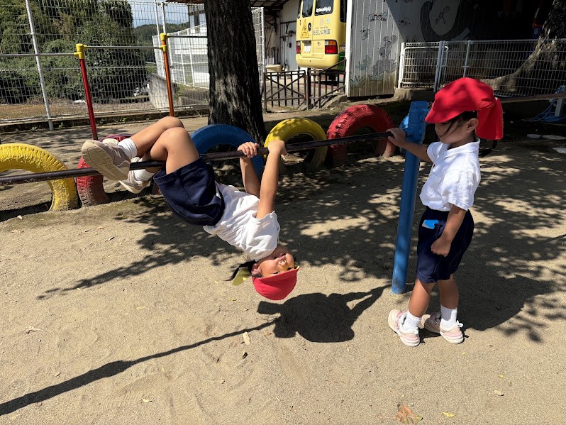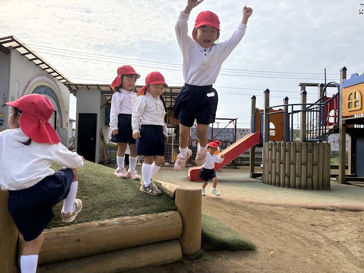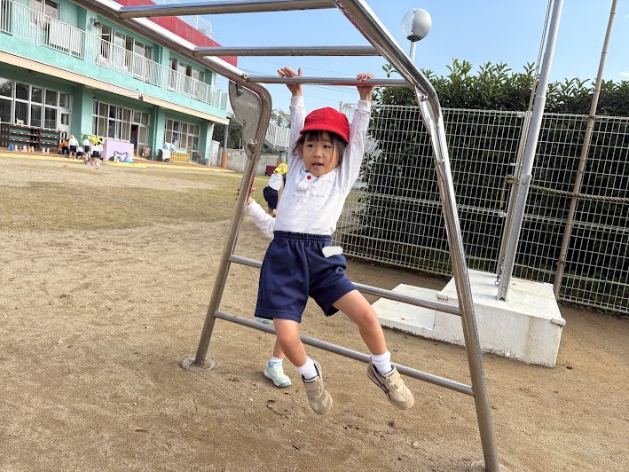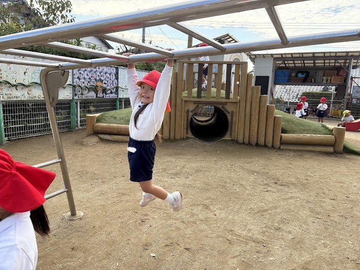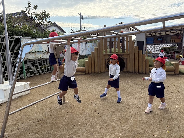 秋の気温になって、過ごしやすくなり、子どもたちは鬼ごっこやしっぽ取りをして、元気に走り回ったり、遊具で遊んだり、お外遊びを楽しんでいますよ~