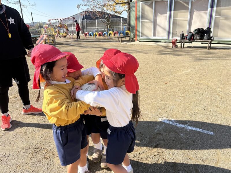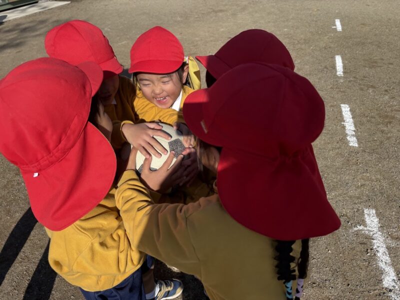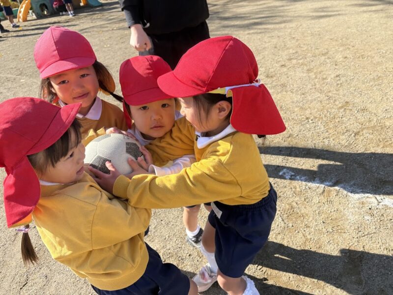 体操教室の一コマ。ボール取り遊び。いつもは取り合いはしない銀杏組さん。体操教室の先生に「取り合いするんだよー」と言われても、「え??取り合いはしちゃダメなんだよ」と子どもたち。そういうルールの遊びなんだと分かるまで、ただボールをみんなで持ってどうしていいか分からない子どもたちをみて、「取り合いはしちゃダメなんだ」ってことが、しっかり身についているんだぁとやさしい心が育っているんだなぁっと思い、嬉しいやら、おかしいやらで、体操教室の先生と笑ってしまいました。