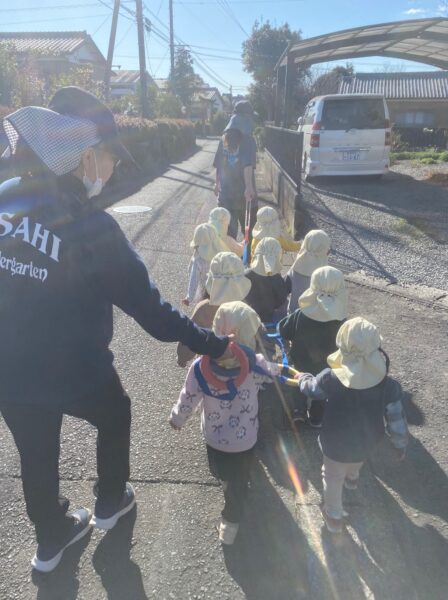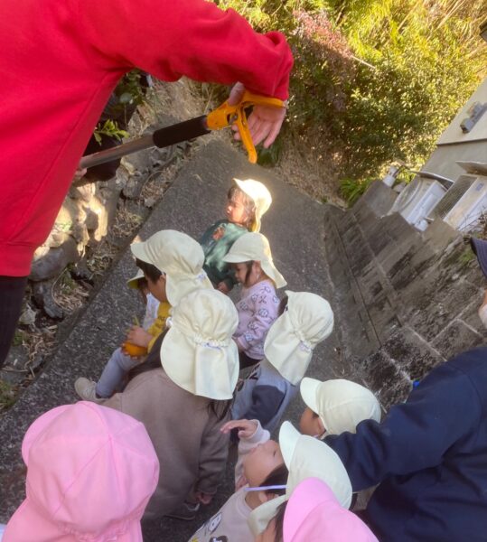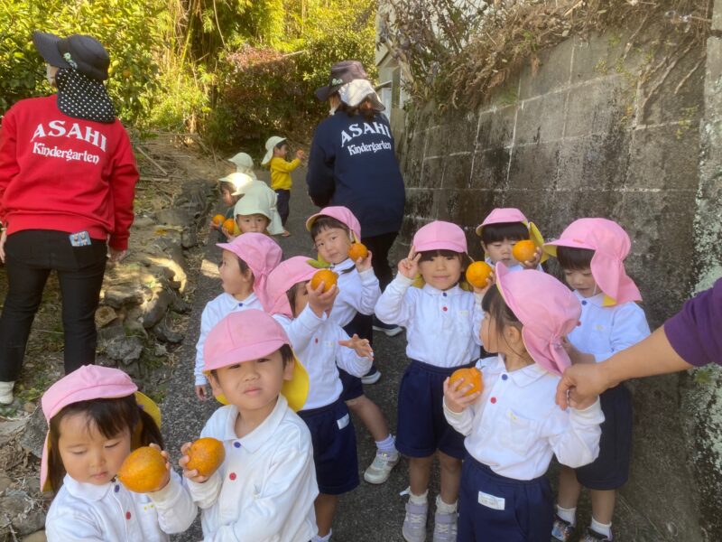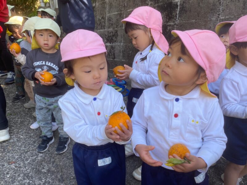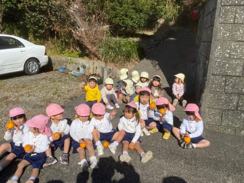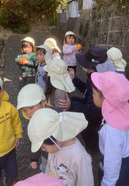 お散歩に行ってきました😊 2026/01/21 沙羅組・蓮華組 沙羅組さん蓮華組さんで、お散歩に出発! みんなで声を掛け合って歩いていました😊 幼稚園のご近所さんのお宅に行き、沢山のみかんを収穫させて頂きました。 みかんを手に取り、うれしそうにしている蓮華組さん! みかんを手に取り、にこにこの沙羅組さん😊 最後はみんなで写真を撮りました☆ 最後に感謝の言葉をしっかりと伝えることができました💖 またみんなでお散歩に行こうねと言って幼稚園に帰りました。 長友さ🚗安達🦋 共有: Facebook で共有するにはクリックしてください (新しいウィンドウで開きます) Facebook クリックして X で共有 (新しいウィンドウで開きます) X いいね:いいね 読み込み中… コメントを残す コメントをキャンセル入力エリアすべてが必須項目です。メールアドレスが公開されることはありません。内容をご確認の上、送信してください。 次回のコメントで使用するためブラウザーに自分の名前、メールアドレス、サイトを保存する。 上に表示された文字を入力してください。 Δ