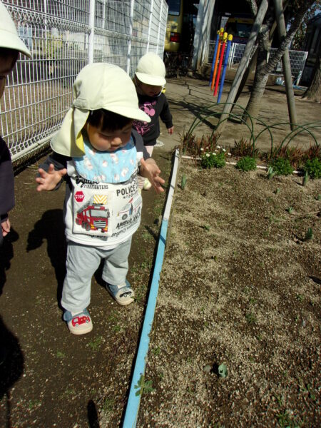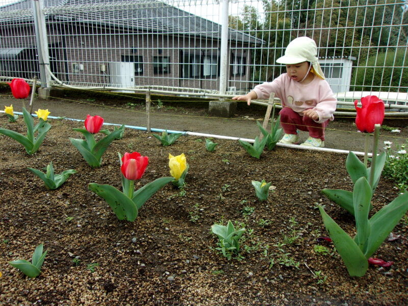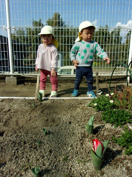 花壇にチューリップが咲いていることに気づいて教えてくれました🌷