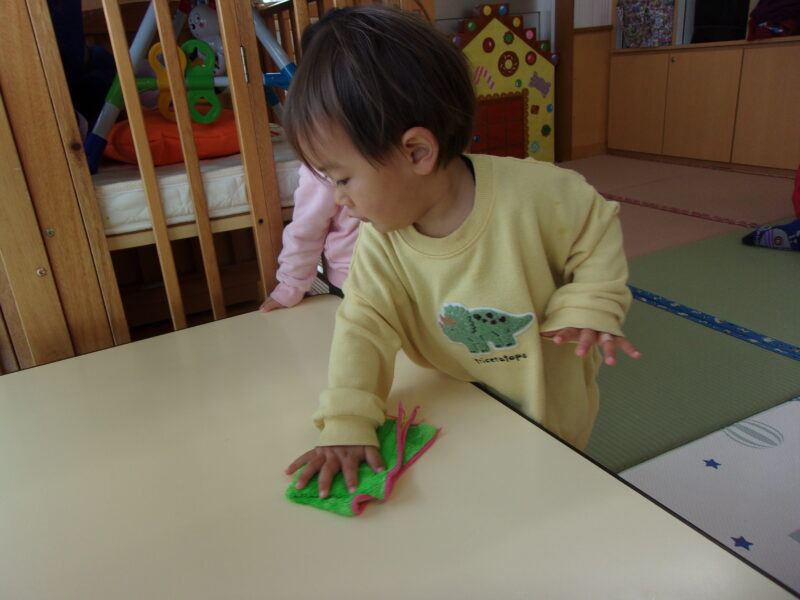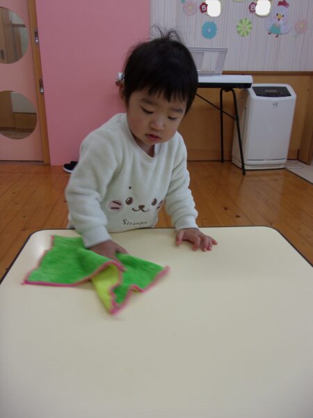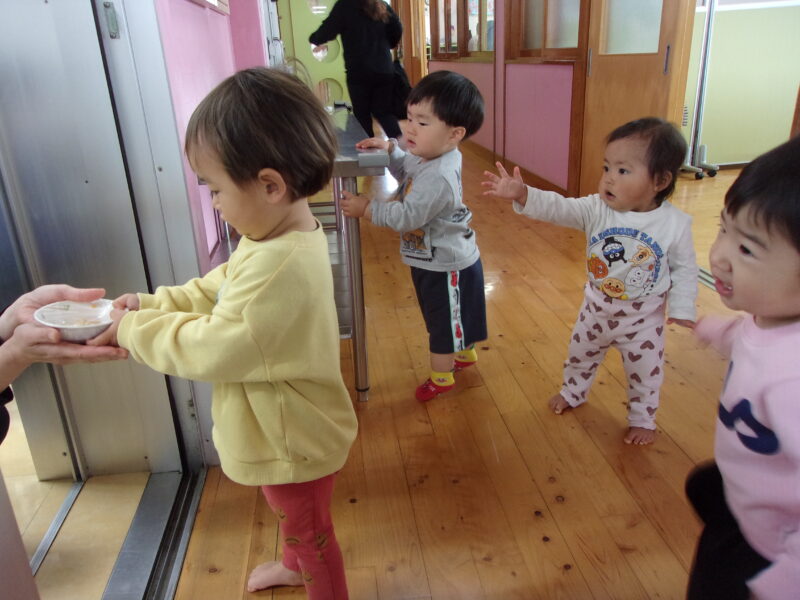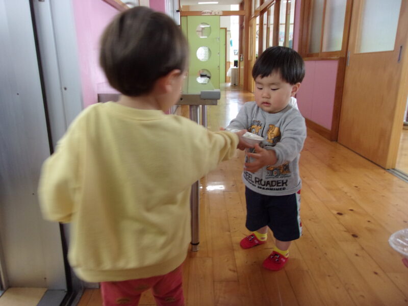 給食室の先生に朝のご挨拶をして、おやつを運ぶお手伝いをしています♡                        自分でできることが増えました!