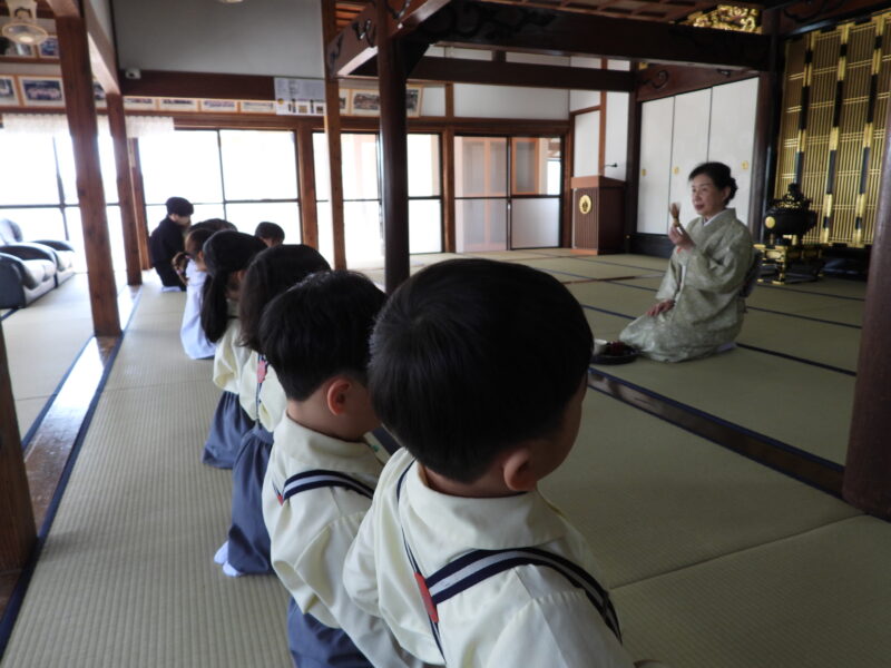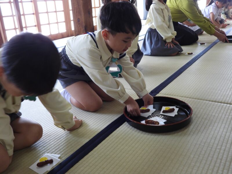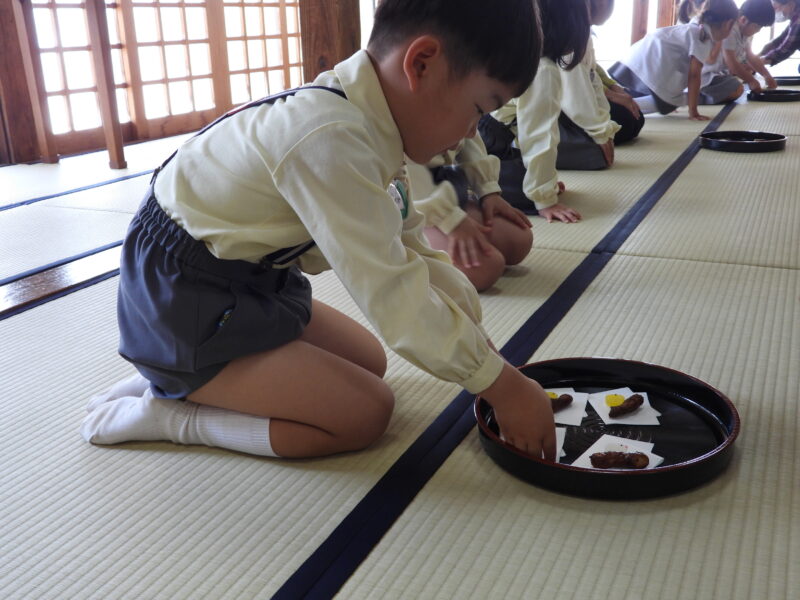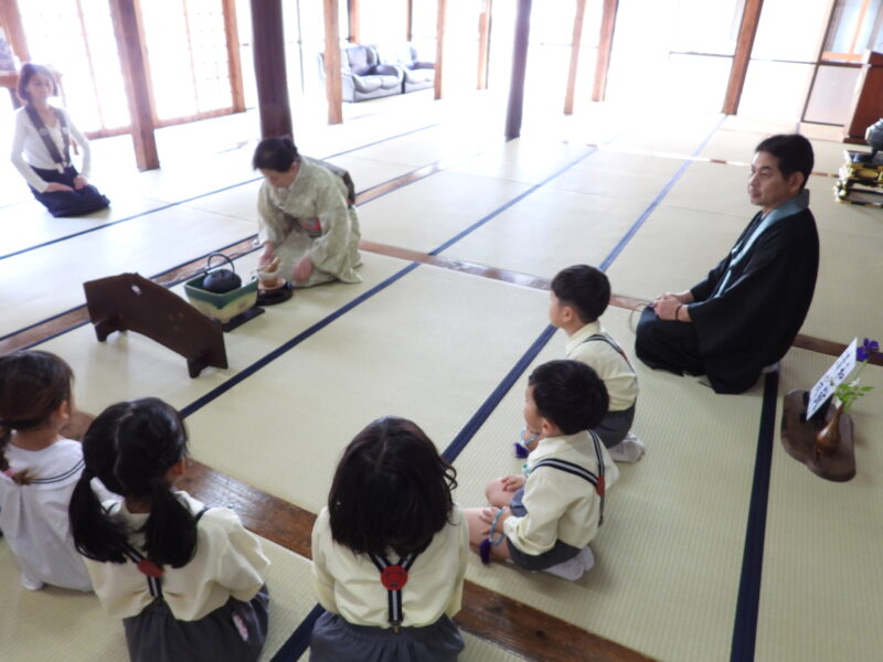 まずは先生による、お献茶の様子を見て、作法の美しさ、場の静寂さに息をのむ子どもたちでした。