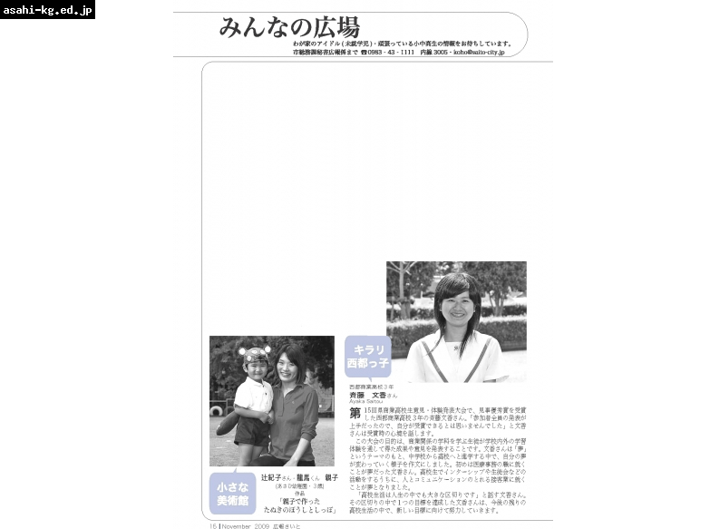 卒園生ニュース他 2009/11/03 西都市の広報誌『広報さいと』11月号の「みんなの広場」のページに、本園第23回卒園生の斉藤文香さんが「キラリ西都っ子」で掲載されています。また、「小さな美術館」には辻龍馬くん親子が掲載されています。どうぞご覧下さい。 共有: Facebook で共有するにはクリックしてください (新しいウィンドウで開きます) Facebook クリックして X で共有 (新しいウィンドウで開きます) X いいね:いいね 読み込み中… コメントを残す コメントをキャンセル入力エリアすべてが必須項目です。メールアドレスが公開されることはありません。内容をご確認の上、送信してください。 次回のコメントで使用するためブラウザーに自分の名前、メールアドレス、サイトを保存する。 上に表示された文字を入力してください。 Δ